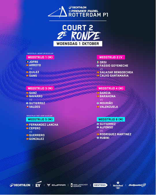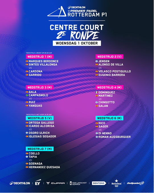 Op het Centre Court komen de grote namen in actie. Coello en Tapia spelen tegen Gañega en Hernández Quesada, terwijl ook Di Nenno en Galán het publiek gaan trakteren op top-padel. Daarnaast zien we Ruiz/Yanguas en spektakel gegarandeerd bij de vrouwen tussen Ortega/Icardo en Osoro/Iglesias.