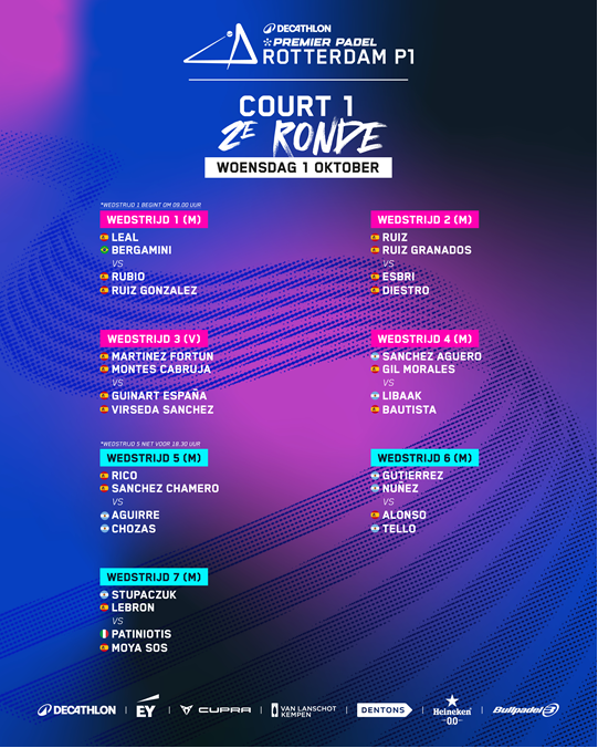 Ook op Court 1 is het genieten: Stupaczuk en Lebrón nemen het op tegen Patiniotis/Moya Sos en Tello komt in actie naast Alonso.